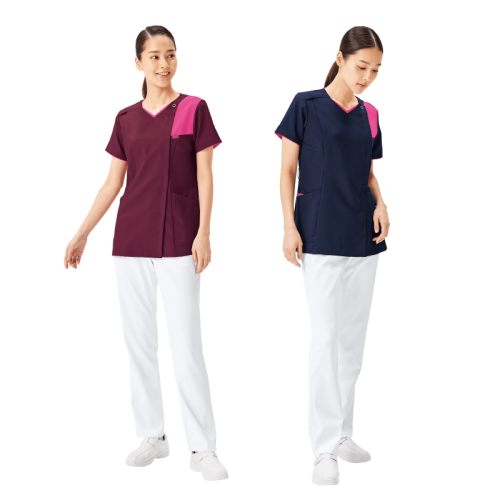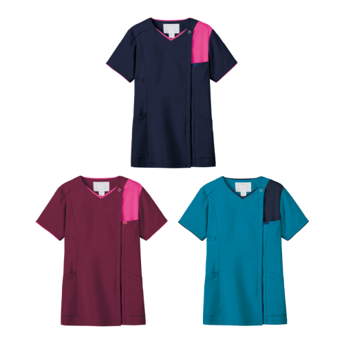 スクラブはメイクの付きにくい羽織るタイプで、着脱のしやすいジップタイプです。