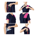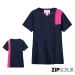 左前から背中にかけたストライプがアクセントになるジップタイプの女性用スクラブ